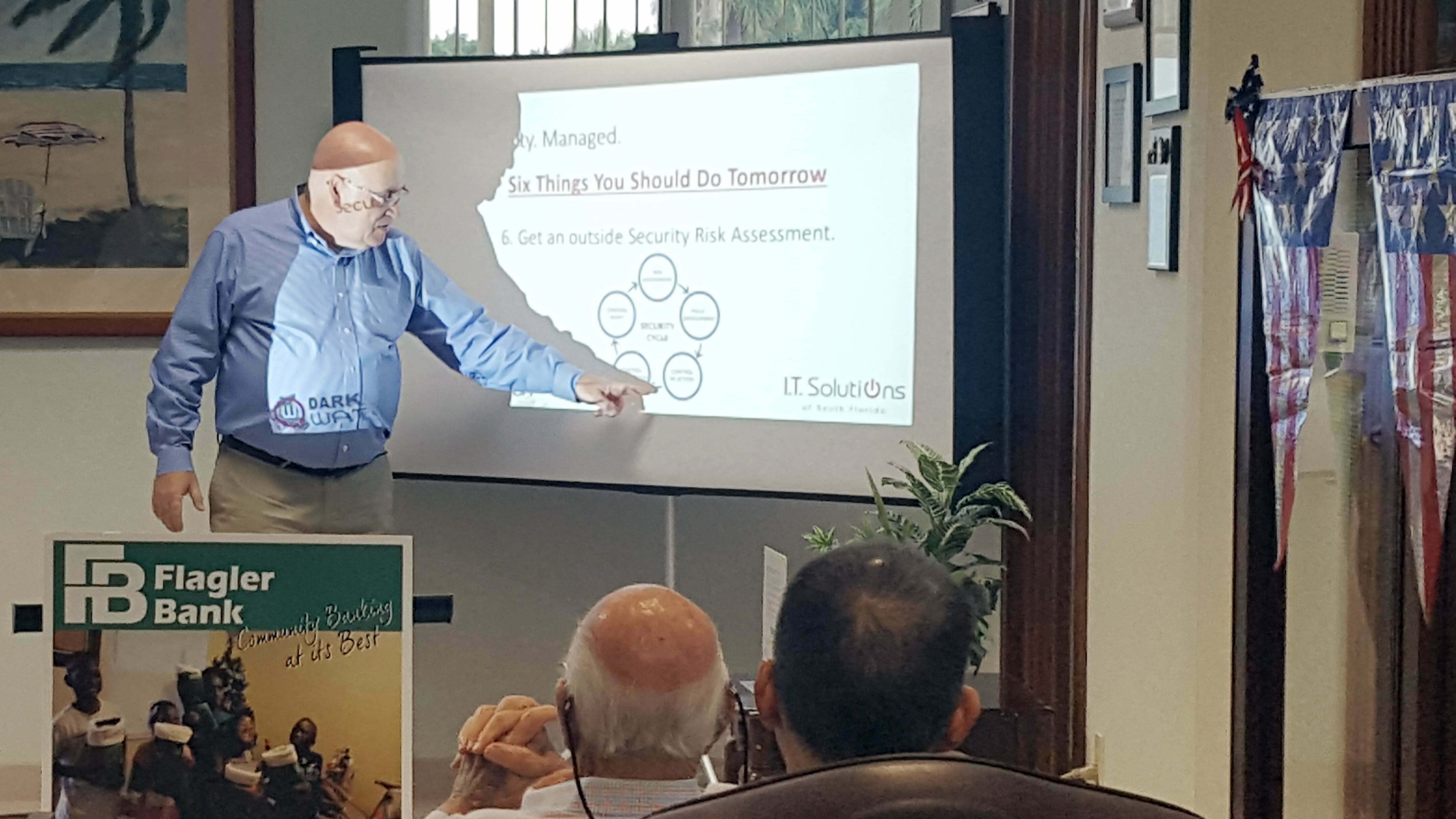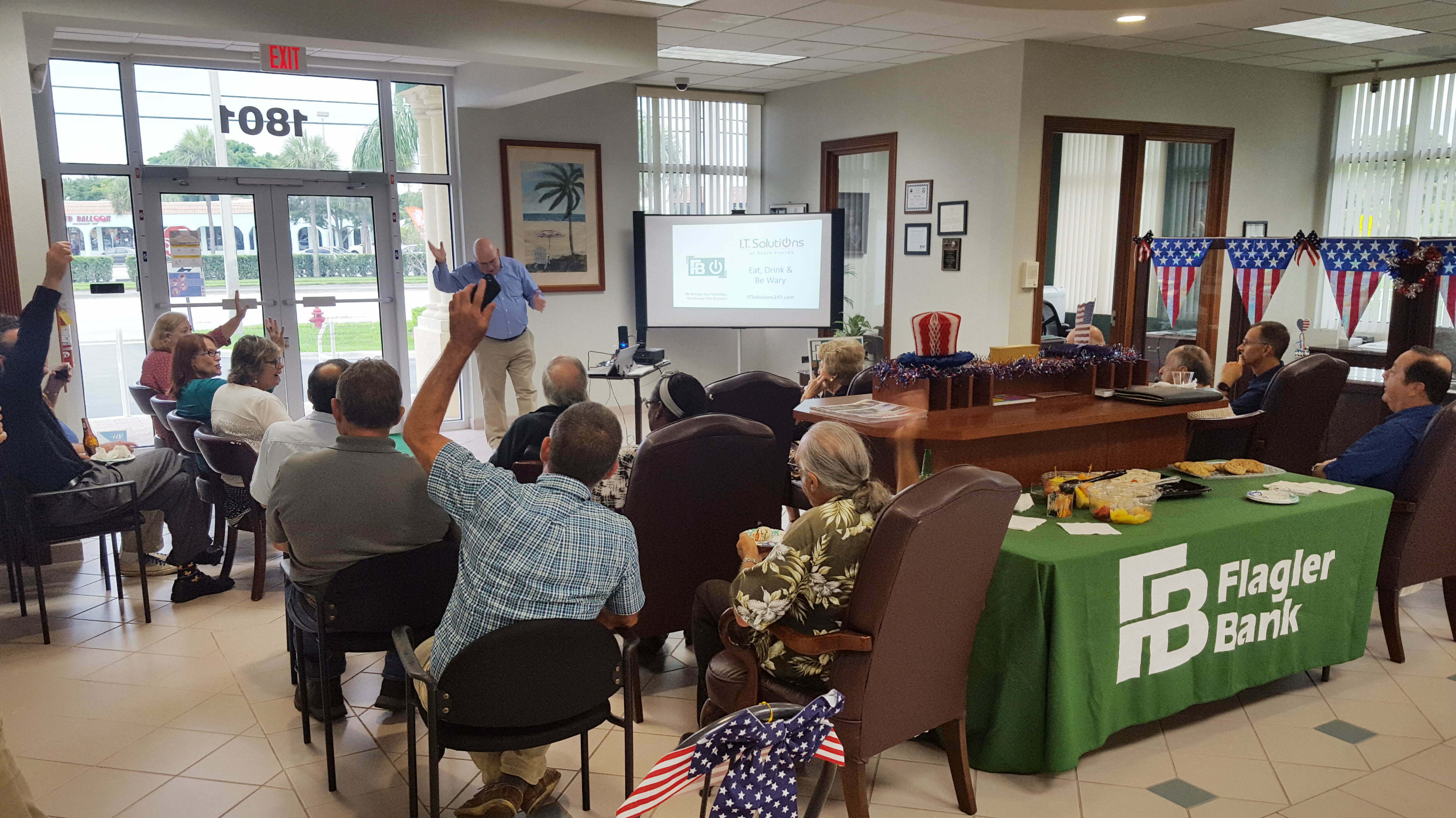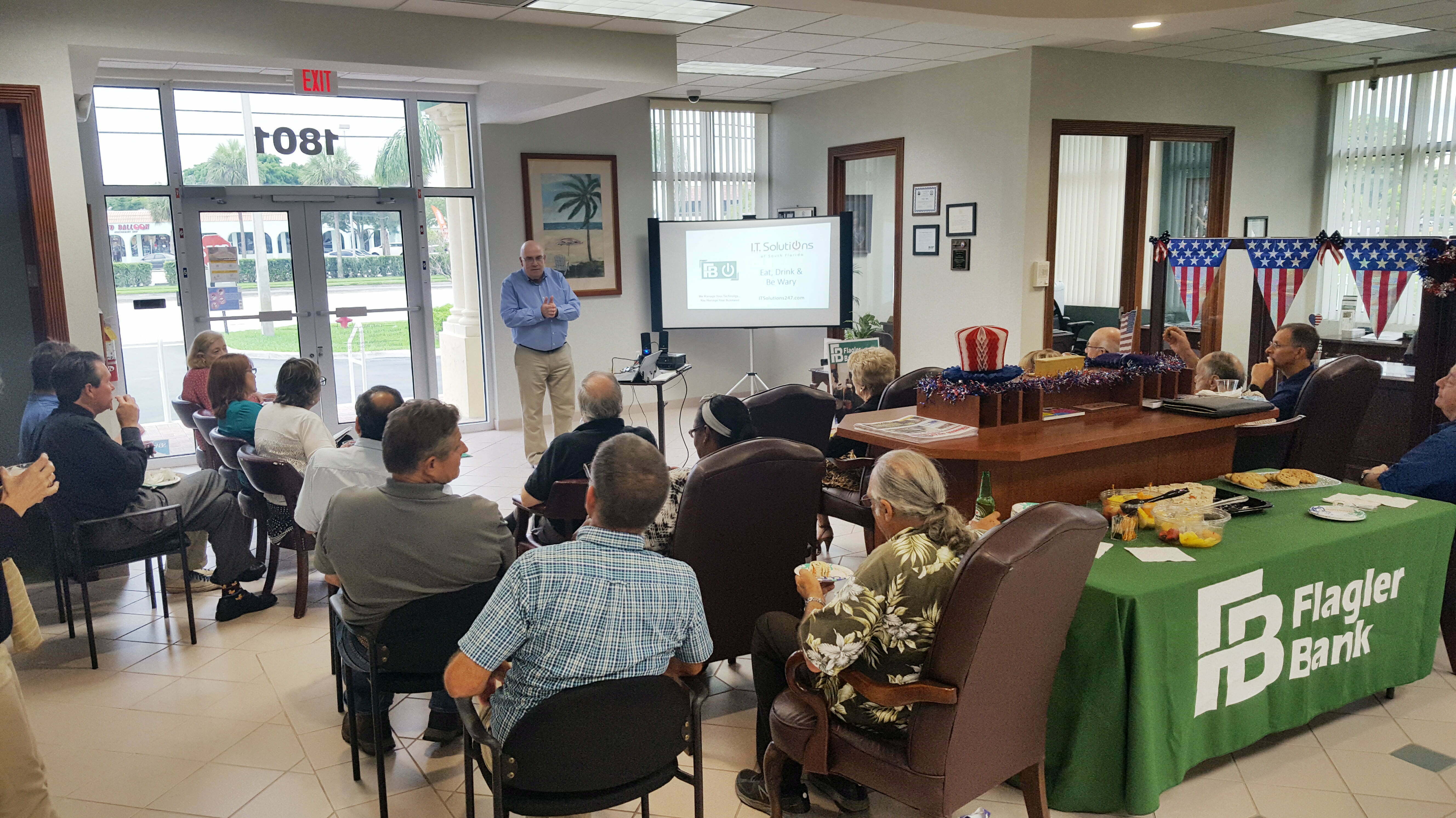 Business owners gathered at the Lake Clarke Shores branch of Flagler Bank to learn about cybersecurity and battling potential threats to their business from weak passwords, phishing emails and ransomware. Mike Gavaghen, VP of Business Solutions at I.T. Solutions of South Florida, was the featured speaker.