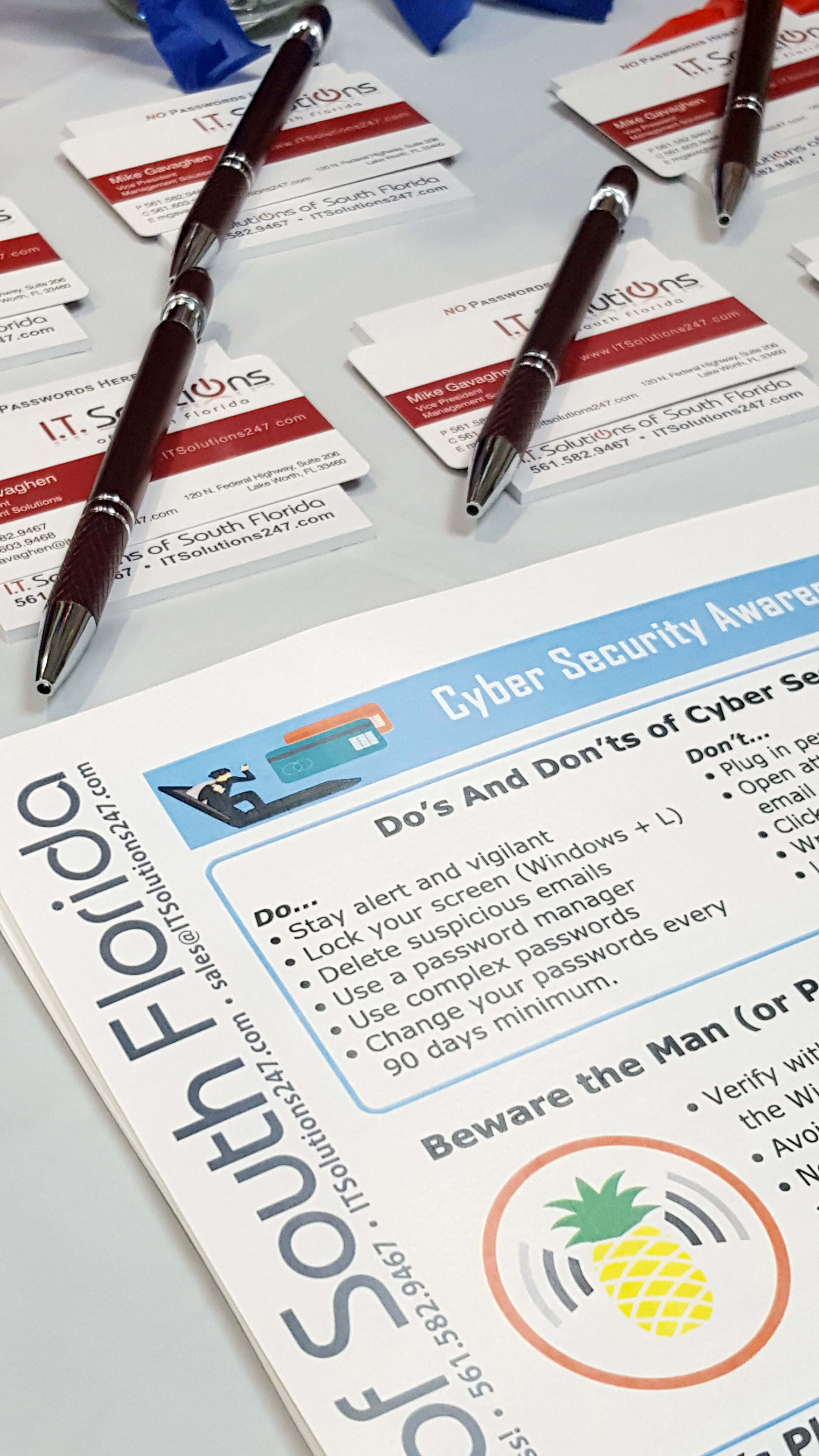 Attendees were also introduced to the concept of man-in-the-middle attacks using a Wi-Fi Pineapple. Everyone got a glimpse into the Dark Web. A few lucky guests also received a free report from Dark Web Watch, a valuable tool from I.T. Solutions of South Florida. The Dark Web Watch report further enforced cyber dangers by detailing company credentials and personal information for sale on the Dark Web.
