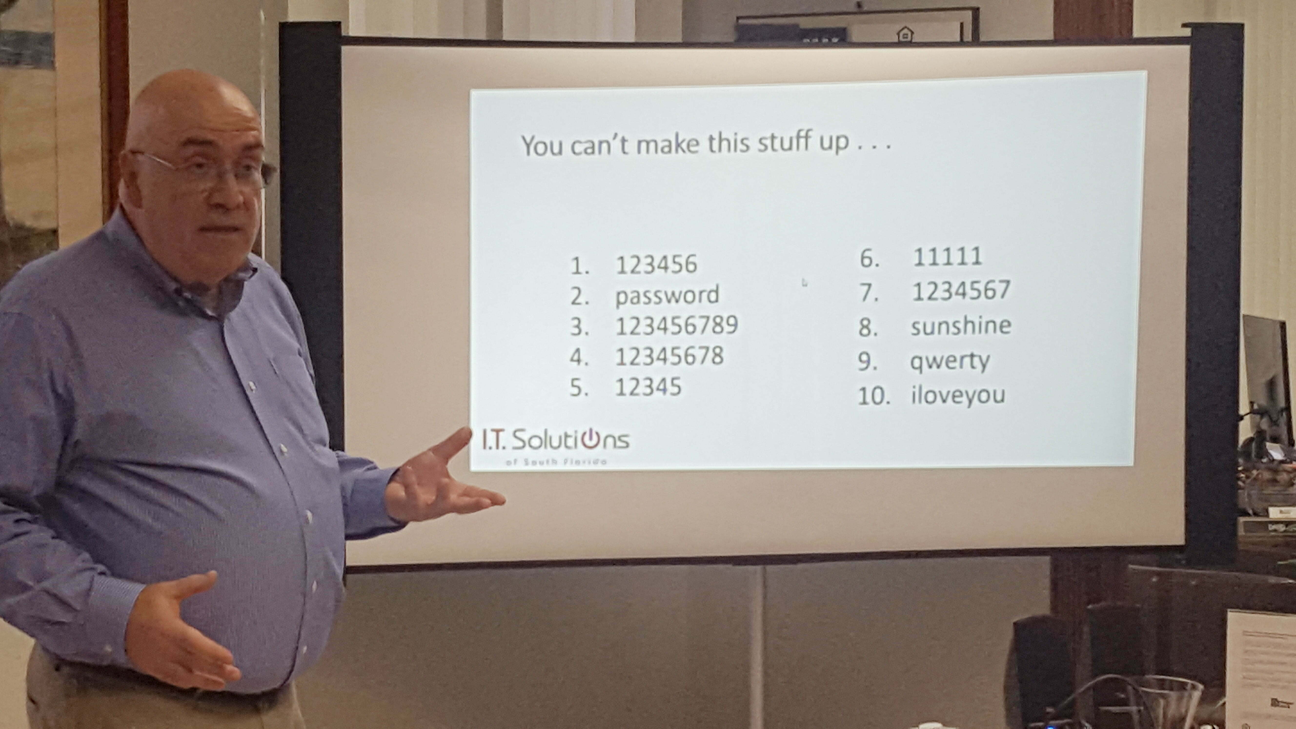 It wasn’t all bad news. Mike offered a simple trick to identify 90 percent of phishing emails, provided examples of fake emails and stressed the importance of testing critical backups. The group also learned valuable ways to create and protect passwords.